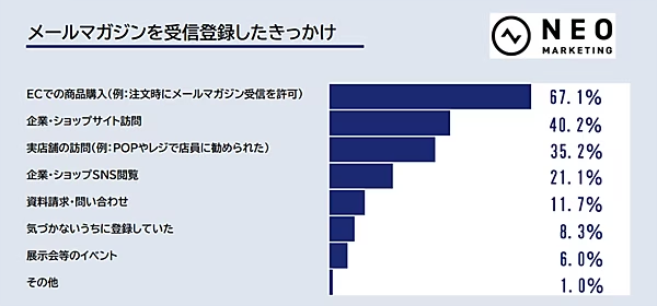 企業やショップが公式LINEやメールマガジンへの登録を促す際、ユーザーがどのタイミングで登録しているのか。ネオマーケティングが実施した調査によると、「ECサイトで商品を購入した直後」に登録するケースが最も多いことが明らかになった。調査対象は 全国の20〜79歳の男女1,000人で、メールやLINEといった「企業とのコミュニケーション手段」に関するデータが収集されている。