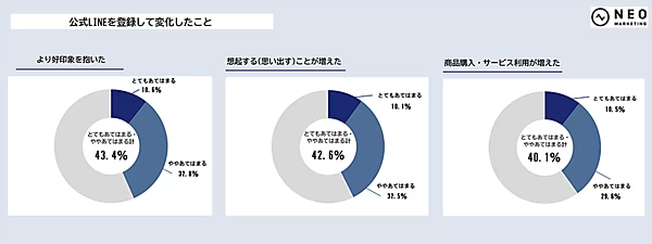 調査では、LINEやメールマガジンの登録が実際にユーザーの行動に影響を与えているかについても確認されている。結果として、登録後にユーザーのブランド・ショップに対する 好印象が増す・想起頻度が高まる・購入や利用の機会が増える といったポジティブな変化を感じている回答者が多かった。