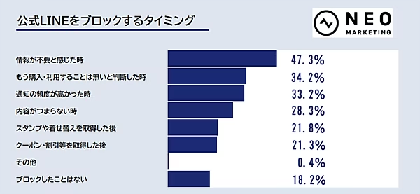 一方で、ユーザーが企業からの情報を 不要と感じたタイミングで即離脱(ブロック・配信停止)してしまう というデータも出ている。公式LINEでもメールマガジンでも、「配信される情報が自分には必要ない」と感じた瞬間にブロックや配信停止を行うユーザーが最も多く、両者共に約半数を占めていた。