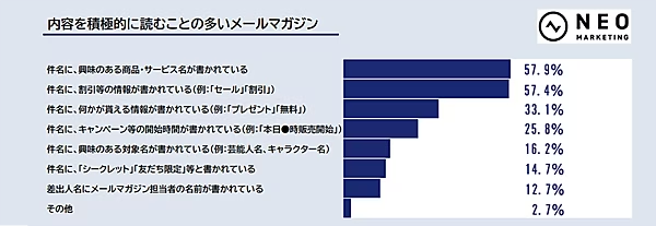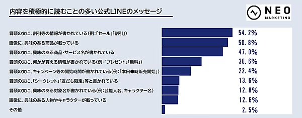 実際に「内容を積極的に読む」と回答したユーザーに共通していたのは、割引やセール情報など具体的なメリットがある内容 だった。調査では、公式LINE・メールマガジン共に「割引・セール情報が書かれているもの」が約半数以上と高い割合を占めている。