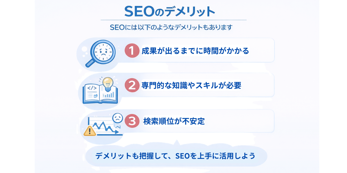 SEOには多くのメリットがありますが、時間や労力がかかる施策であることも事実です。すぐに成果を求めるビジネスや、検索ニーズが小さい商材では、十分な効果を得られない場合もあります。