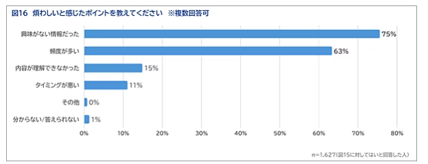 一方で、企業からの情報配信を「煩わしい」と感じた経験についても調査が行われた。回答者の約51%が「煩わしいと感じたことがある」と答えている。最も多かった理由が「興味のない情報だった(75%)」、次いで「頻度が多い(63%)」という結果になった。