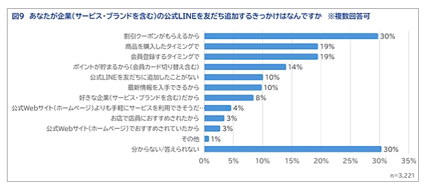 また、企業の公式LINEを「友だち追加」する理由でも、割引クーポンの提供が30%と突出した。この傾向は、若年層を中心にお得な情報=追加する動機につながっている可能性がある。一方で、70代以上では利用経験がない人が25%を超えるなど、高齢層ではLINE登録のハードルが比較的高い点も浮かび上がった。