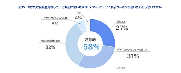 位置情報を活用したマーケティングについての質問では、「会員登録しているお店に来た瞬間、スマホに割引クーポンが届いたらどう思うか」という問いに対し、回答者の58%が「嬉しい・どちらかというと嬉しい」と肯定的な反応を示した。対して「不快・どちらかというと不快」と答えた人は9%にとどまった。